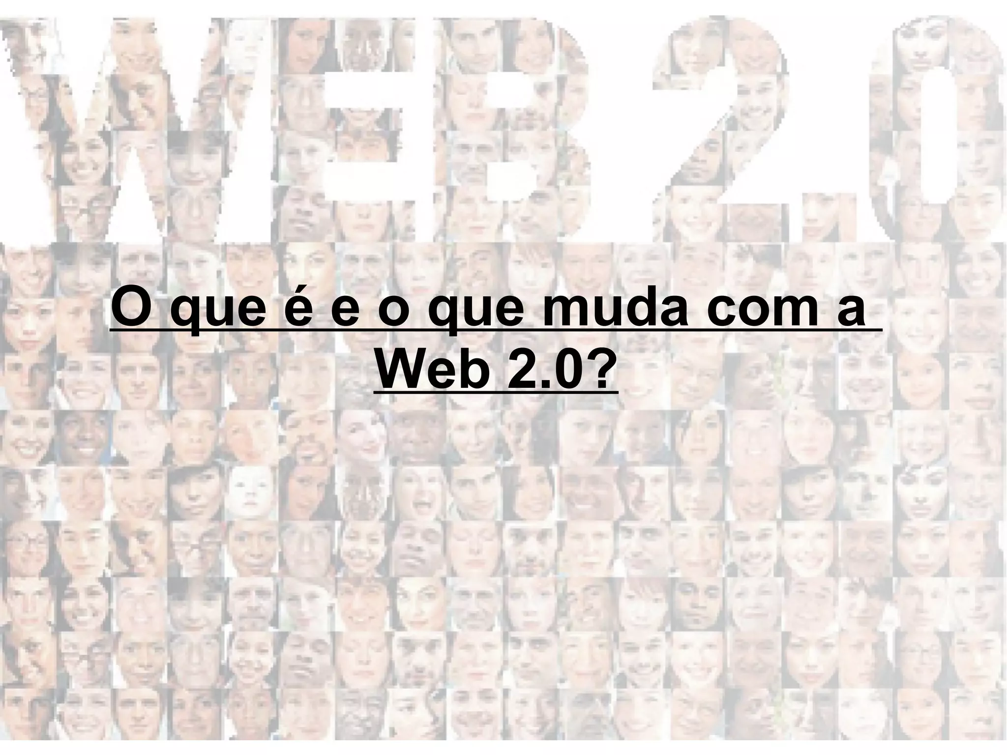 O documento discute a Web 2.0, definindo-a como uma tendência que reforça a colaboração e troca de informações entre usuários em sites e serviços. Alguns exemplos de ferramentas Web 2.0 são blogs, wikis e redes sociais. A principal mudança é que o usuário passa de mero leitor para produtor ativo de conteúdo. Empresas precisam adotar essas ferramentas para permitir a colaboração entre funcionários.