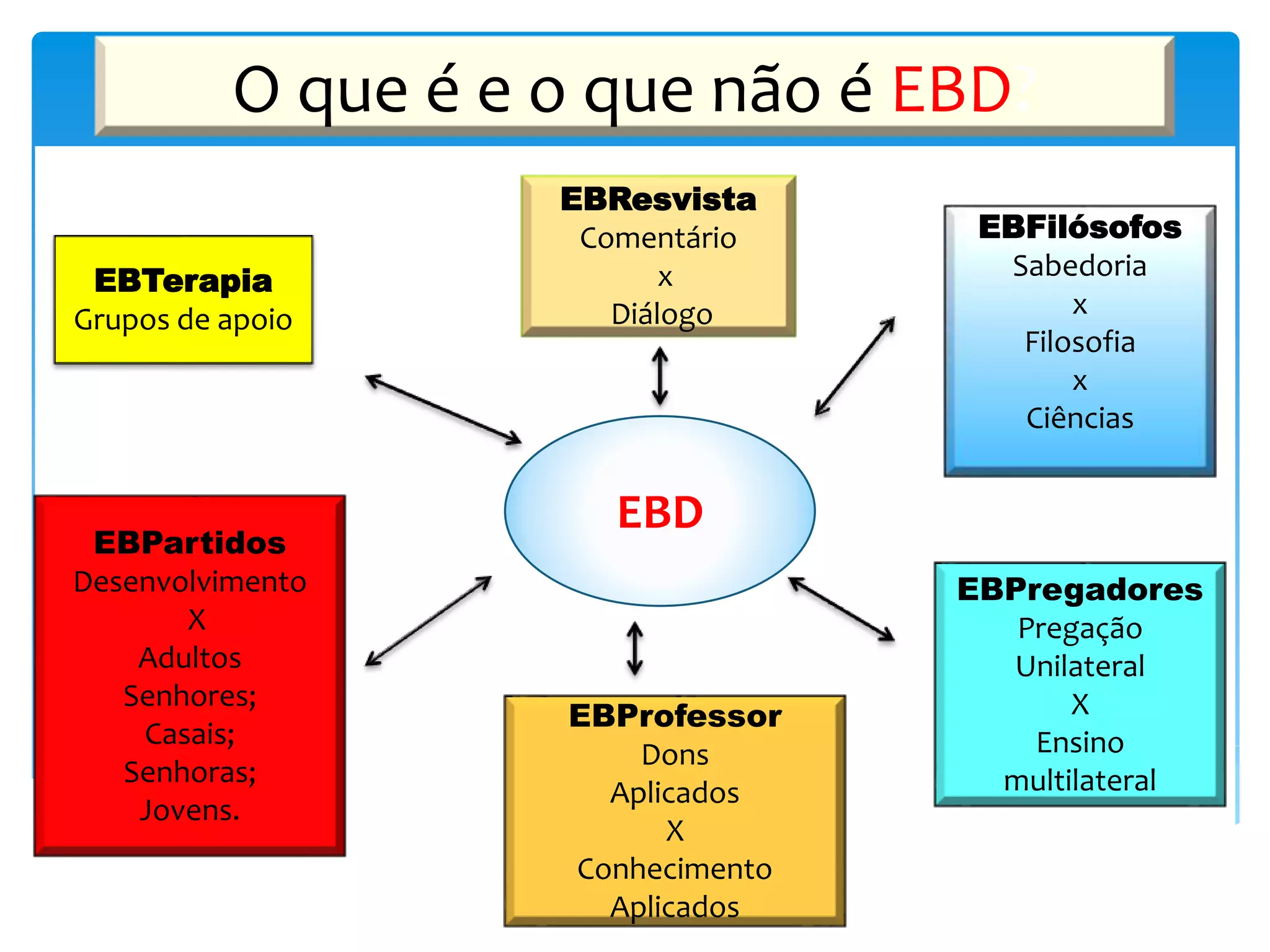 O documento discute os conceitos de EBD, comparando o que é e não é considerado EBD. Ele lista vários termos como "revista", "filosofia", "partidos", "professor" e "terapia", indicando se cada um se enquadra ou não na definição de EBD.