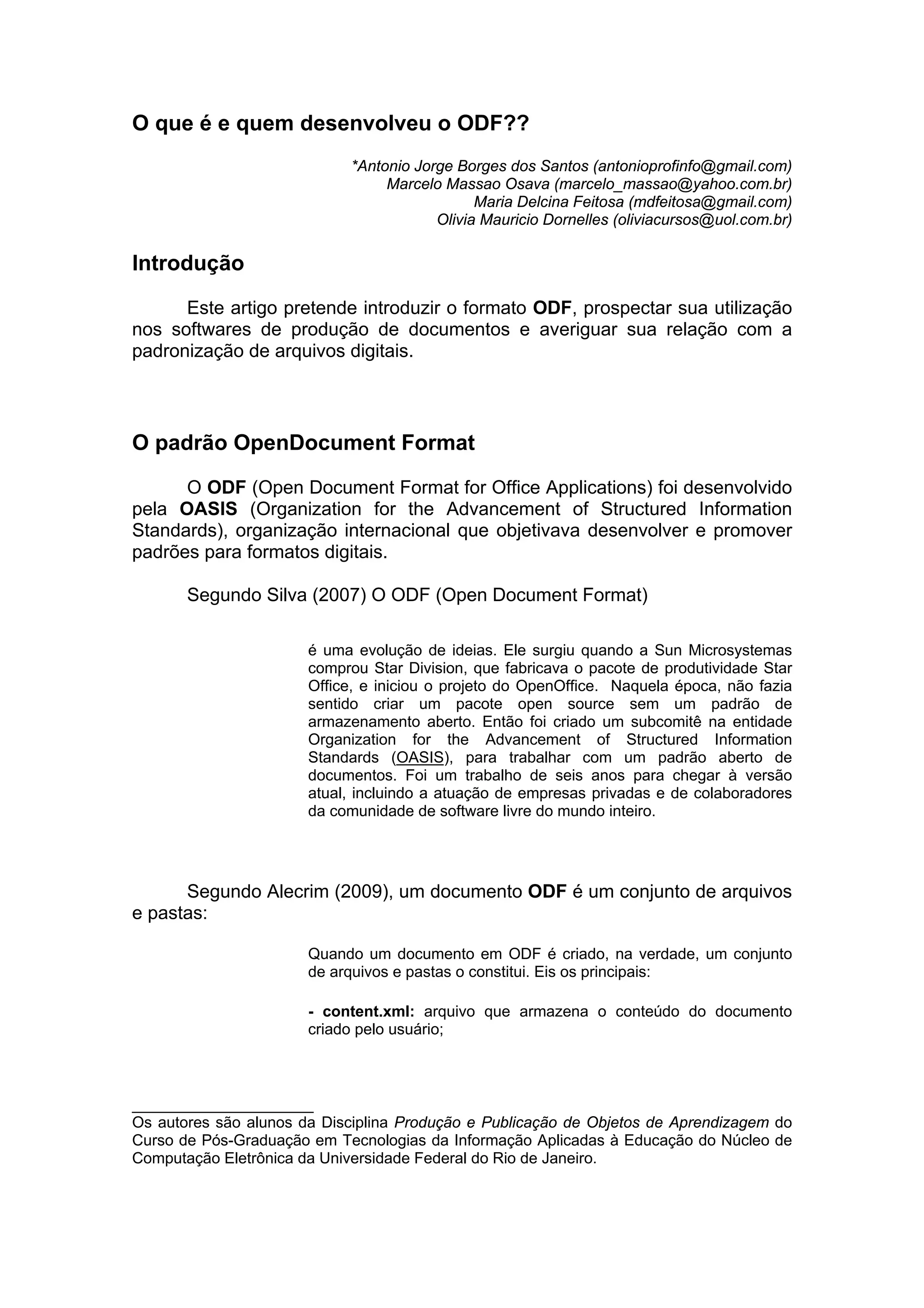 O ODF foi desenvolvido pela OASIS para padronizar formatos digitais de documentos. É composto por arquivos XML que armazenam conteúdo, estilos, metadados e imagens. Foi adotado como padrão brasileiro em 2008 e é suportado por softwares como OpenOffice, Microsoft Office e Google Docs.