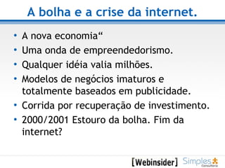 1. O documento discute a evolução da web, da "Web 1.0" para a "Web 2.0", com maior participação e colaboração dos usuários na criação e organização de conteúdo.