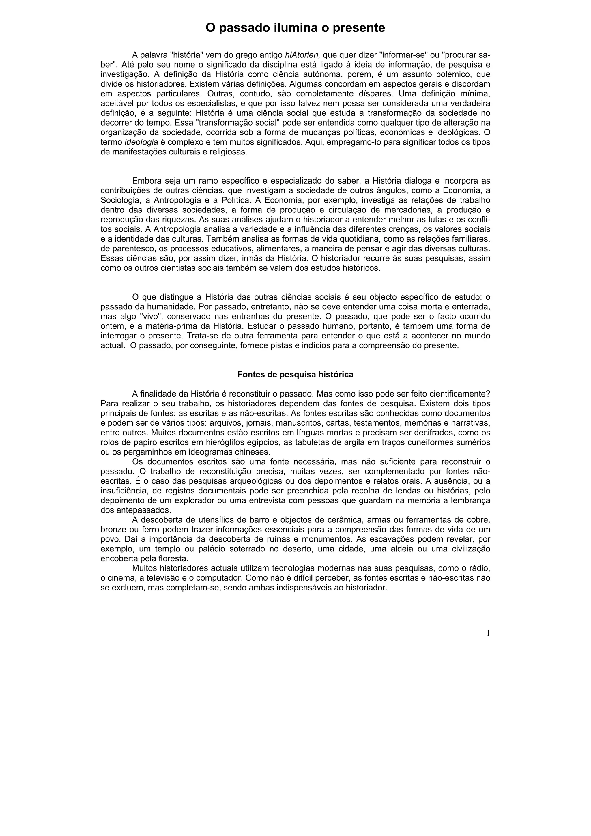 1) O documento discute a definição de História como uma ciência social que estuda a transformação da sociedade ao longo do tempo através de mudanças políticas, econômicas e ideológicas.