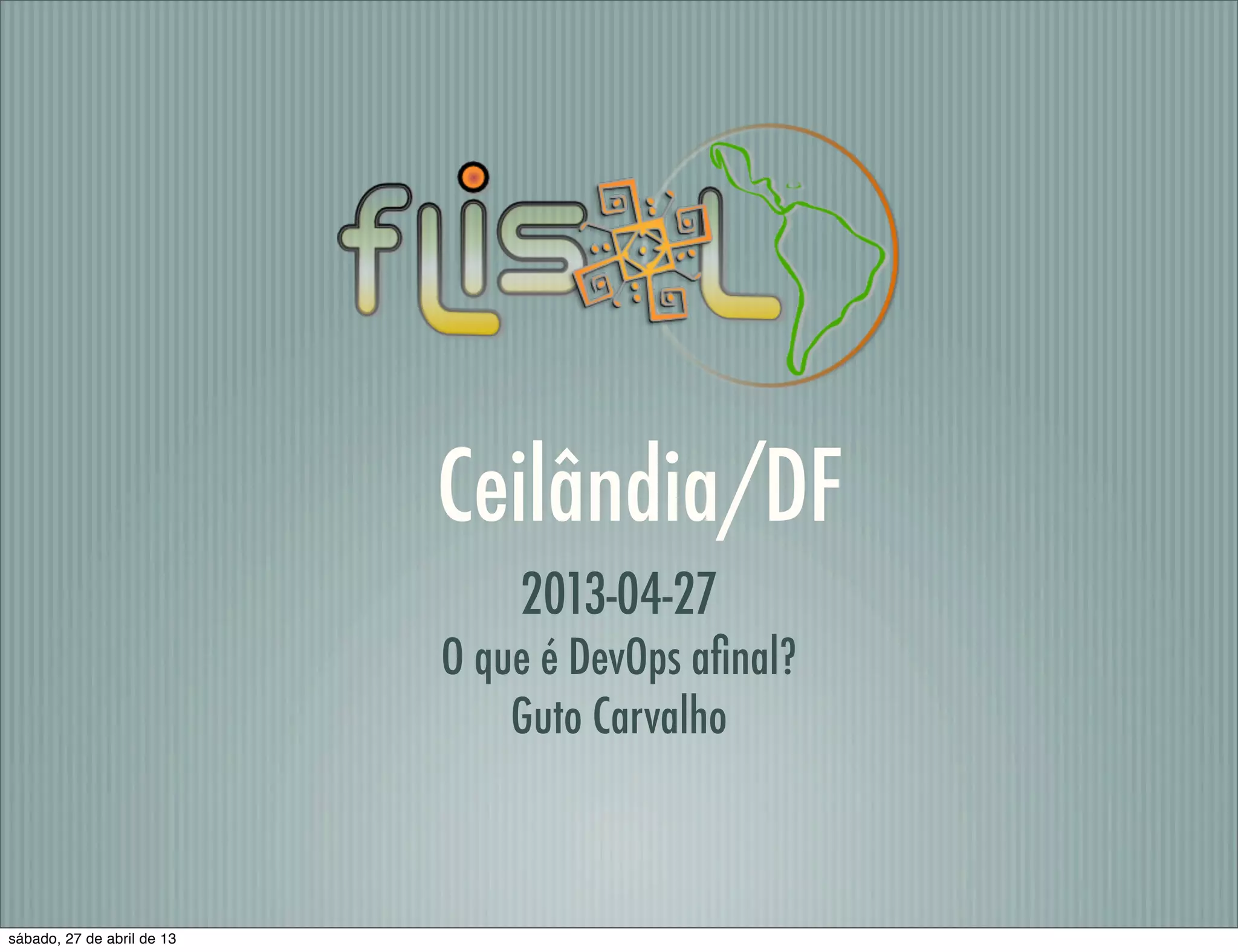 O documento apresenta uma palestra sobre DevOps. Aborda o conceito de DevOps, seu surgimento, a cultura DevOps e como aplicá-la. Explica o conflito entre equipes de infraestrutura e desenvolvimento e como a cultura DevOps pode ajudar a resolver esse conflito promovendo uma melhor colaboração entre as equipes.