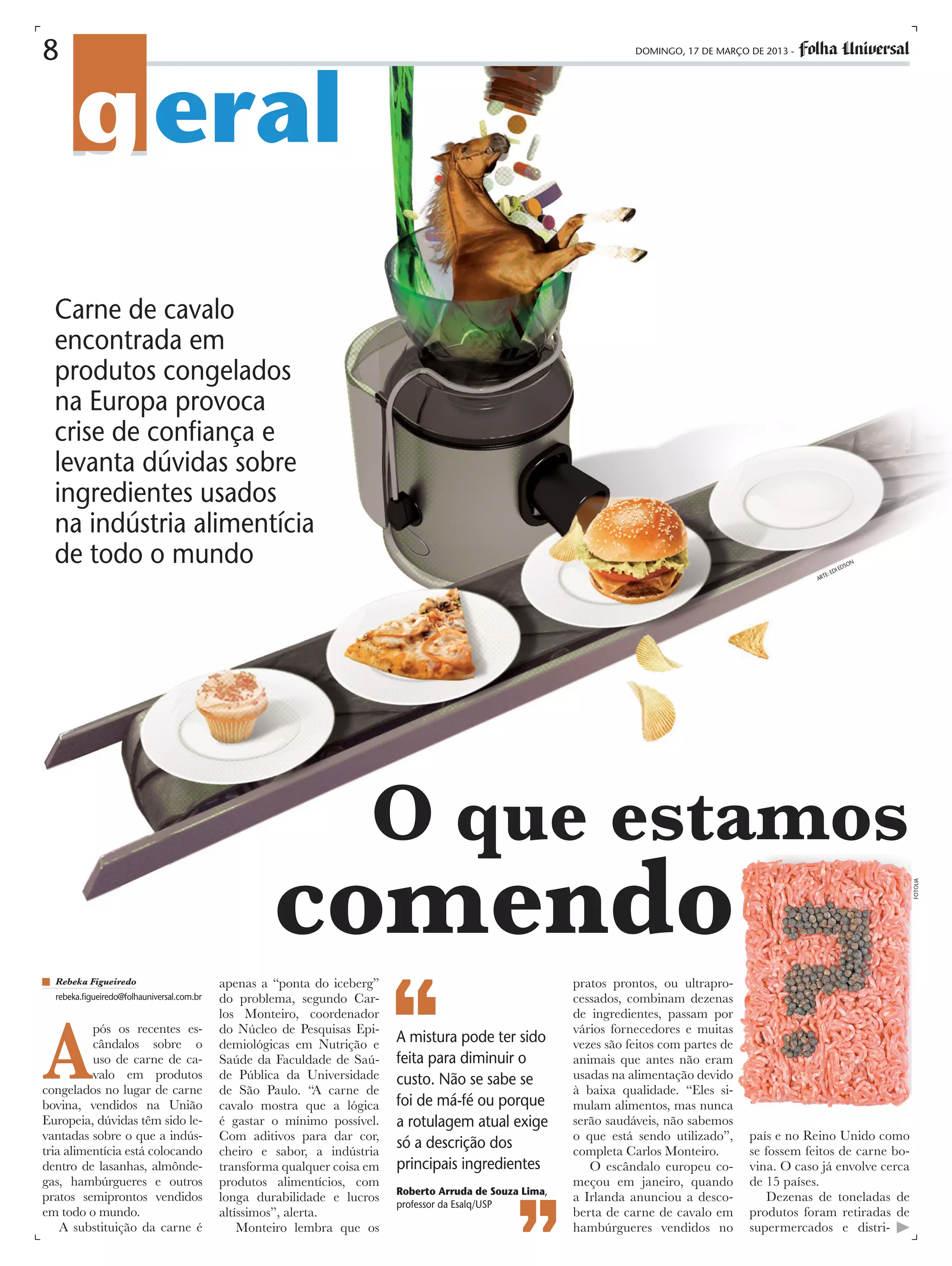 O documento discute o escândalo da carne de cavalo encontrada em produtos congelados na Europa no lugar da carne bovina anunciada. Isso levantou dúvidas sobre os ingredientes usados na indústria alimentícia global. Carlos Monteiro alerta que a indústria transforma qualquer coisa em alimentos lucrativos usando aditivos. A substituição da carne pode ter sido para reduzir custos.