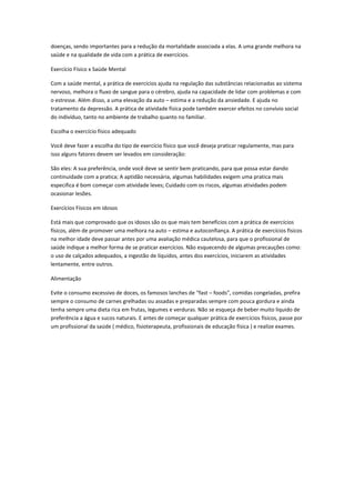 O documento discute o que é exercício físico e seus benefícios para a saúde. A prática regular de
