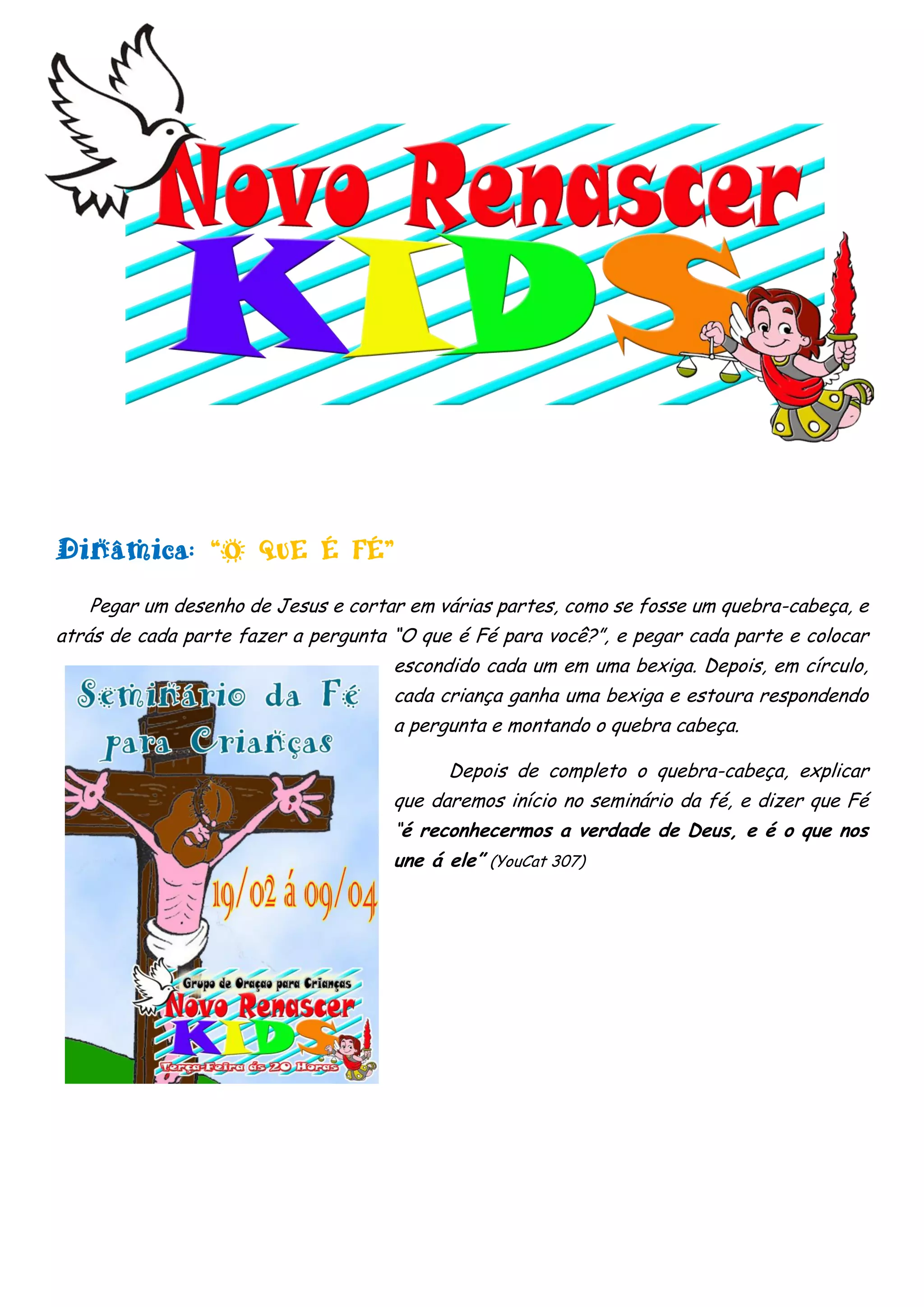 A dinâmica propõe dividir um desenho de Jesus em partes escondidas em bexigas, cada uma com a pergunta "O que é fé para você?". As crianças irão estourar suas bexigas e montar o quebra-cabeça respondendo a pergunta, para então discutir que fé é reconhecer a verdade de Deus e o que nos une a Ele.