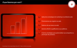 A Kronedesign oferece serviços de marketing digital, incluindo estratégias para redes sociais, sites e e-mail marketing para promover negócios. Eles criam conteúdo personalizado para cada público-alvo e medem os resultados das campanhas para melhorar o desempenho. Contratando a Kronedesign, empresas podem aumentar o tráfego, vendas e exposição da marca de forma customizada e rápida.