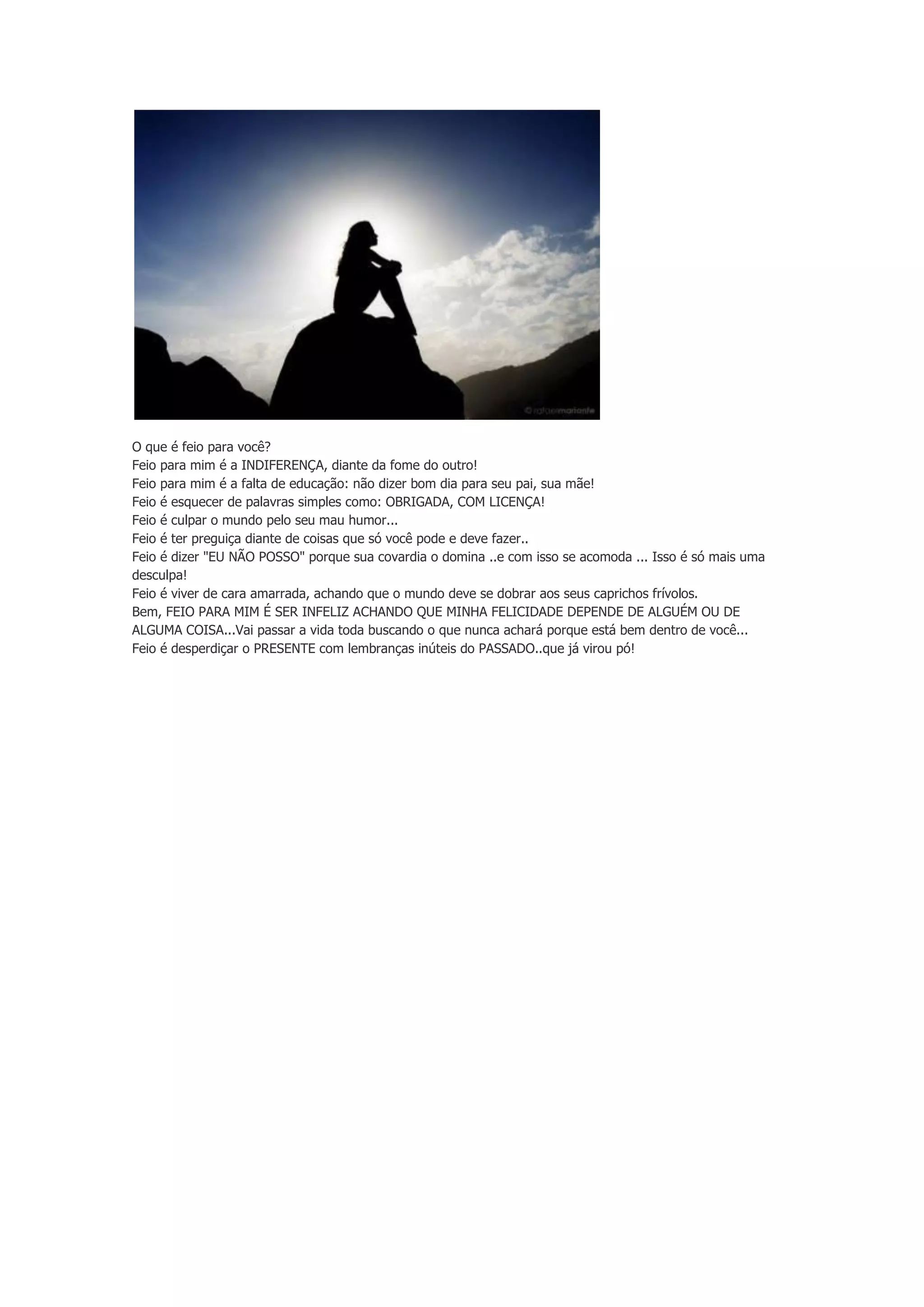 O documento lista vários comportamentos e atitudes que o autor considera "feios", incluindo a indiferença com a fome dos outros, a falta de educação, culpar o mundo pelo mau humor, ter preguiça de fazer suas obrigações, viver de cara amarrada achando que o mundo deve se dobrar aos seus caprichos, e achar que a felicidade depende de algo externo e não de si mesmo. O autor também aponta como feio desperdiçar o presente com lembranças inúteis do passado.