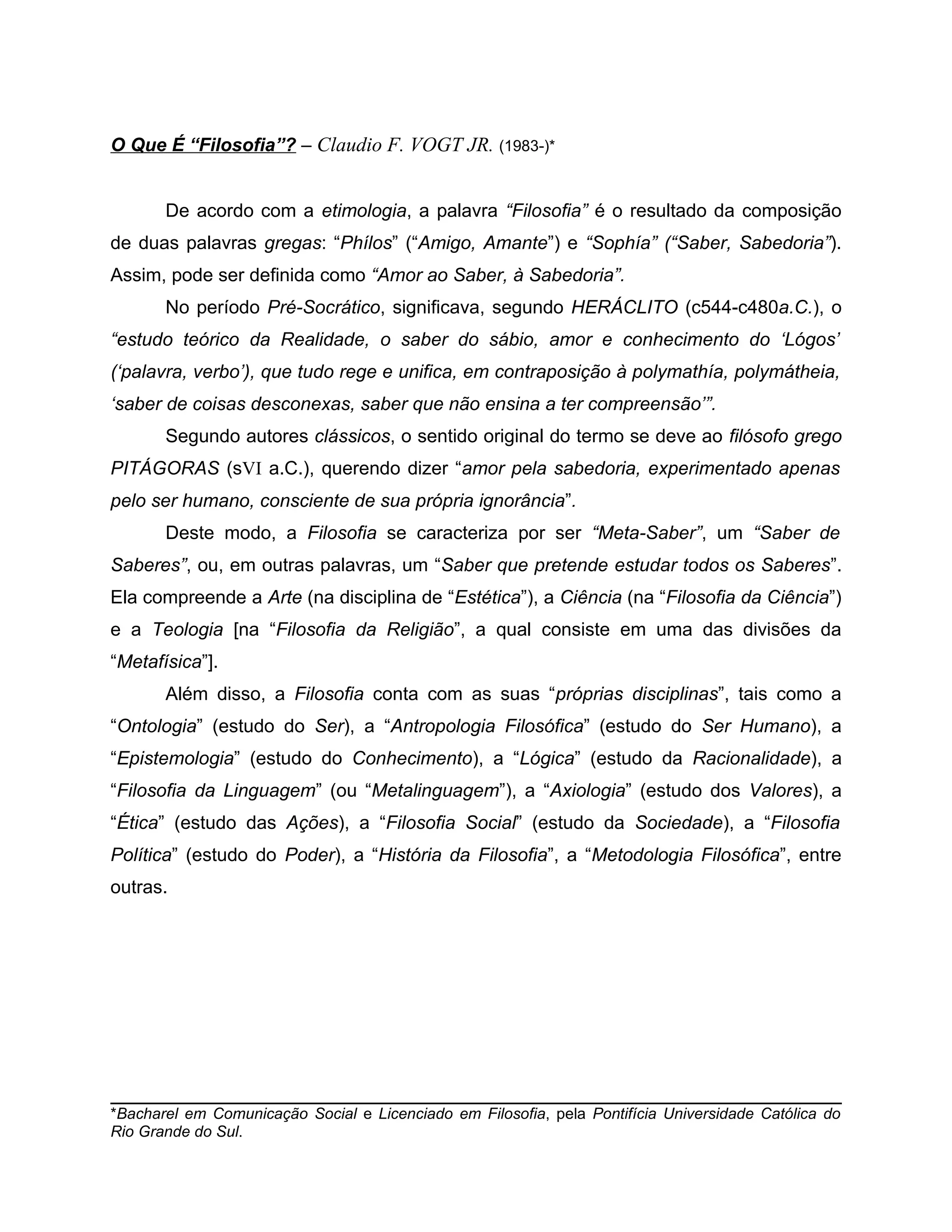 A filosofia é definida como o "amor à sabedoria" segundo a etimologia da palavra. Segundo Heráclito, significava o estudo teórico da realidade e o saber do sábio. Pitágoras via como o amor pela sabedoria experimentado pelo ser humano consciente de sua própria ignorância. A filosofia é caracterizada como um saber de saberes que estuda todas as áreas do conhecimento, incluindo arte, ciência, teologia e possui suas próprias disciplinas como ontologia e ética.