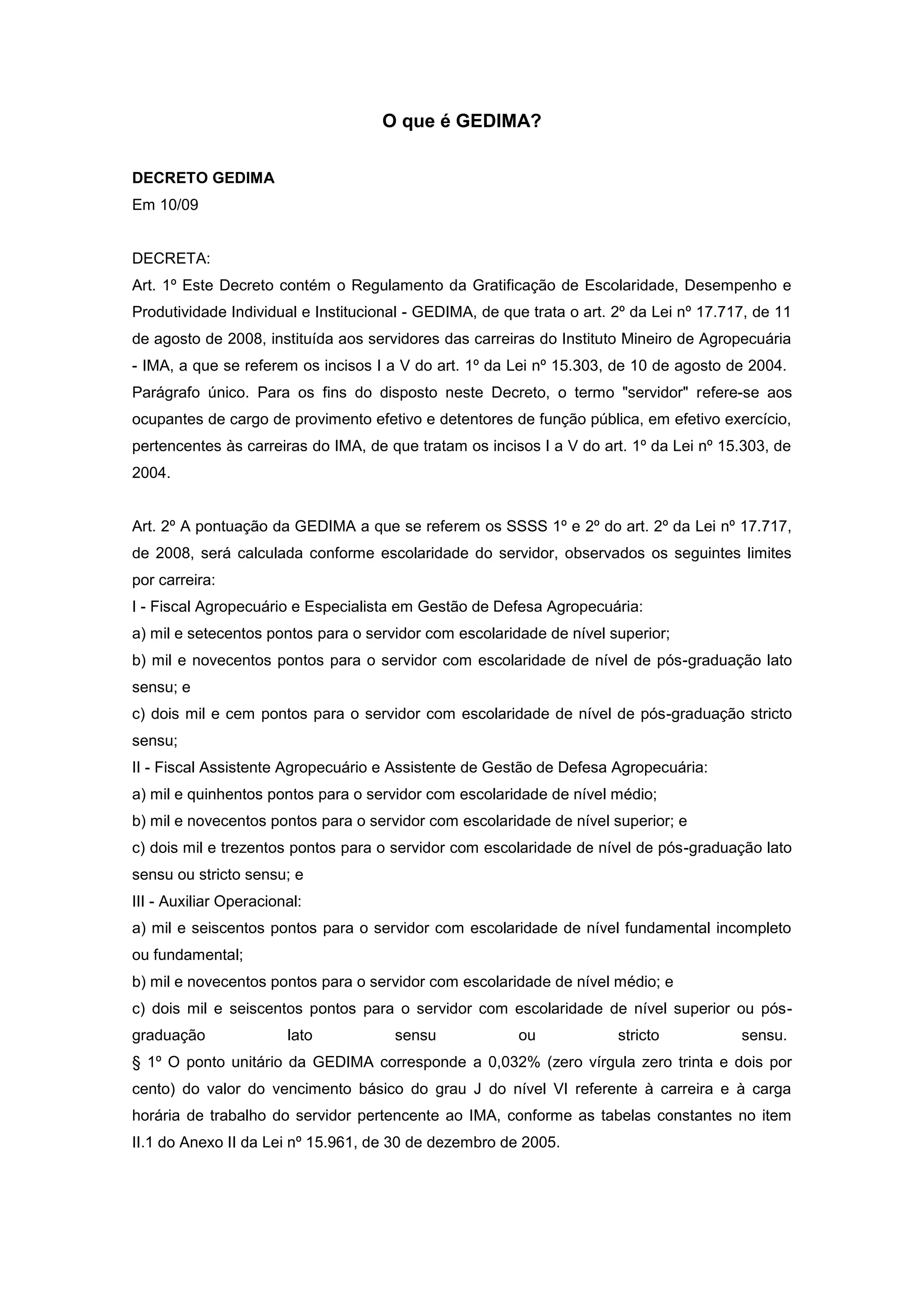 Este documento descreve o Regulamento da Gratificação de Escolaridade, Desempenho e Produtividade Individual e Institucional (GEDIMA) para servidores do Instituto Mineiro de Agropecuária (IMA). A GEDIMA é calculada com base na escolaridade, avaliação de desempenho e tempo de serviço do servidor. O valor da gratificação é pago mensalmente e recalculado a cada semestre.
