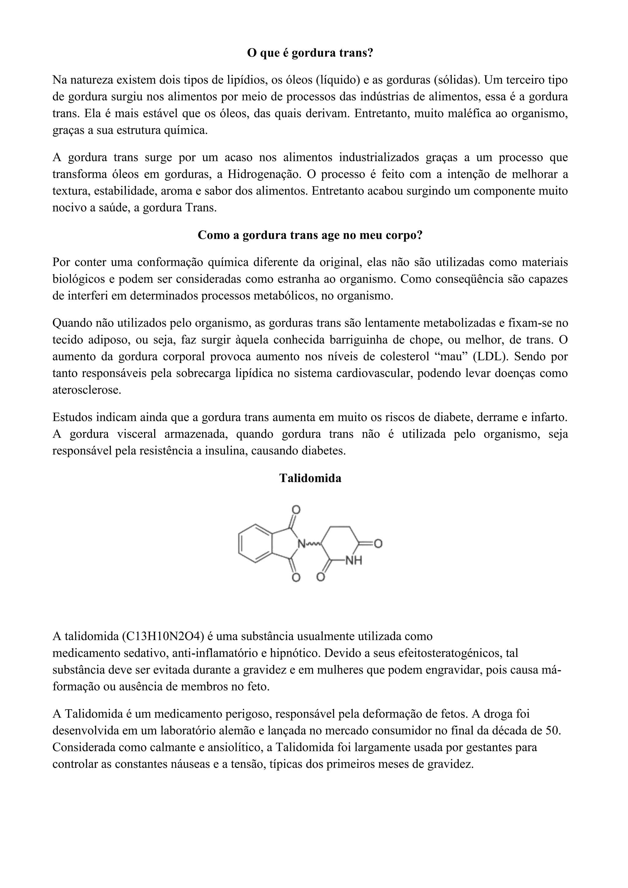 A gordura trans surge de processos industriais como a hidrogenação e é prejudicial à saúde, podendo causar doenças cardiovasculares. A talidomida, usada como sedativo, causou má-formações em fetos na década de 1950 devido a testes insuficientes. Sua distribuição no Brasil ainda causa casos de crianças com defeitos, por falta de informação.