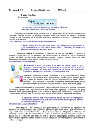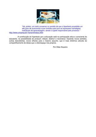 O documento define hipertexto como um modelo de documento não linear interligado por nós como palavras, imagens e sons. A máquina Memex de Vannevar Bush é considerada precursora da ideia de hipertexto por armazenar e acessar informações. Hipertexto permite acessar blocos de informação como texto e mídia através de hiperlinks e contribui para a construção compartilhada de conhecimento e aprendizagem autônoma dos estudantes.