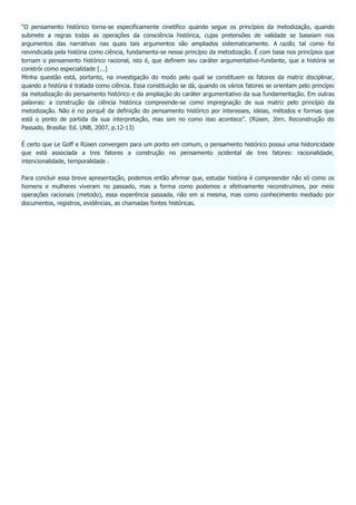 O documento discute o significado da palavra "história" e como o conhecimento histórico é produzido. Ele explica que "História" refere-se à disciplina acadêmica, enquanto "história" refere-se ao objeto de estudo, a experiência humana no tempo. Também discute como o significado de "história" mudou ao longo do tempo e entre sociedades. Finalmente, argumenta que estudar história envolve reconstruir o passado de forma racional através de fontes históricas e evidências.