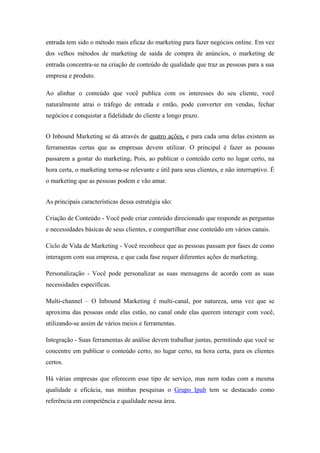O Inbound Marketing é uma estratégia que promove empresas através de conteúdo como blogs, podcasts e redes sociais para atrair clientes de forma orgânica, ao invés de táticas agressivas. Ele foca em criar conteúdo relevante para os clientes ao longo de seu ciclo de vida, personalizado por canal, com o objetivo de converter leads em vendas e clientes fiéis.