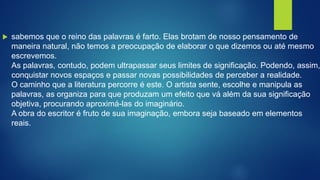 A literatura é uma manifestação artística que utiliza palavras de maneira criativa, transcendendo sua significação original para explorar novas possibilidades de percepção da realidade. O escritor, através de sua imaginação e sensibilidade, captura a realidade e manipula a linguagem em níveis diversos, criando obras literárias. O texto literário se destaca pela predominância da função poética.