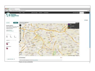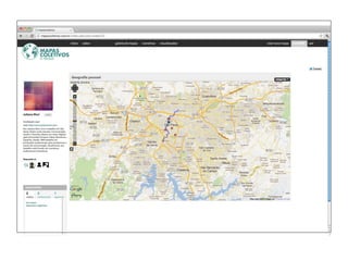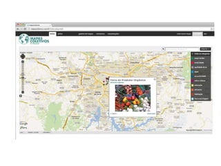 MapasColetivos é uma plataforma colaborativa que permite que cidadãos mapeiem dados sobre qualidade de vida em suas cidades e criem novos indicadores públicos de forma participativa através de jornalismo cidadão e mapeamento coletivo de problemas e soluções em 10 categorias.