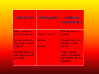 Este documento discute o bullying, incluindo o que é, como faz as vítimas se sentirem, e por que algumas pessoas se tornam bullies. Também fornece conselhos sobre como lidar com o bullying, evitar ser alvo, e parar de ser um bully.