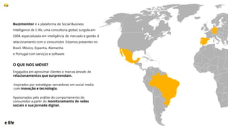 Buzzmonitor é uma plataforma de social business intelligence focada na análise de comportamento do consumidor e gestão de relacionamento. Oferece diversas ferramentas, como monitoramento de redes sociais, gestão de crises, e análise de desempenho de campanhas, proporcionando relatórios customizáveis e dashboards em tempo real. A empresa está presente em vários países e visa aproximar clientes e marcas através de estratégias inovadoras em social media.