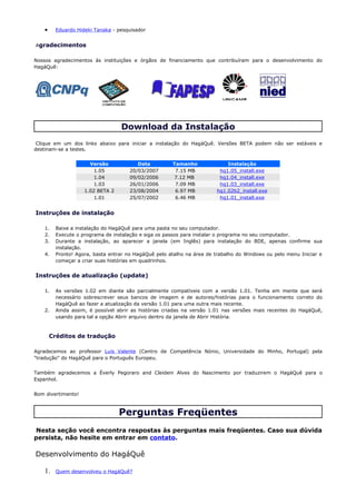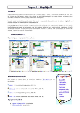 O documento descreve o HagáQuê, um software para criação de histórias em quadrinhos com fins educacionais. Ele foi desenvolvido para facilitar a criação por crianças e inclui recursos para acessibilidade. O texto fornece detalhes sobre as telas, vídeos demonstrativos, equipe, downloads e perguntas frequentes sobre o software.