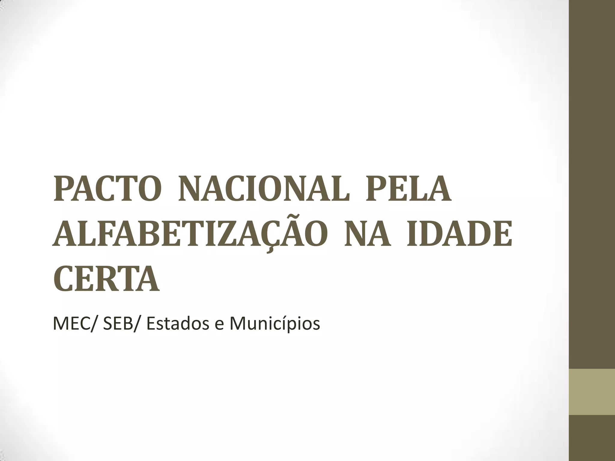 O documento descreve o Pacto Nacional pela Alfabetização na Idade Certa, um compromisso entre governos para garantir que todas as crianças estejam alfabetizadas até os oito anos de idade. O Pacto envolve ações como formação de professores, uso de materiais pedagógicos, avaliações contínuas e gestão compartilhada entre entes federados. Seu objetivo é assegurar o direito de todas as crianças à alfabetização até o final do 3o ano do ensino fundamental.