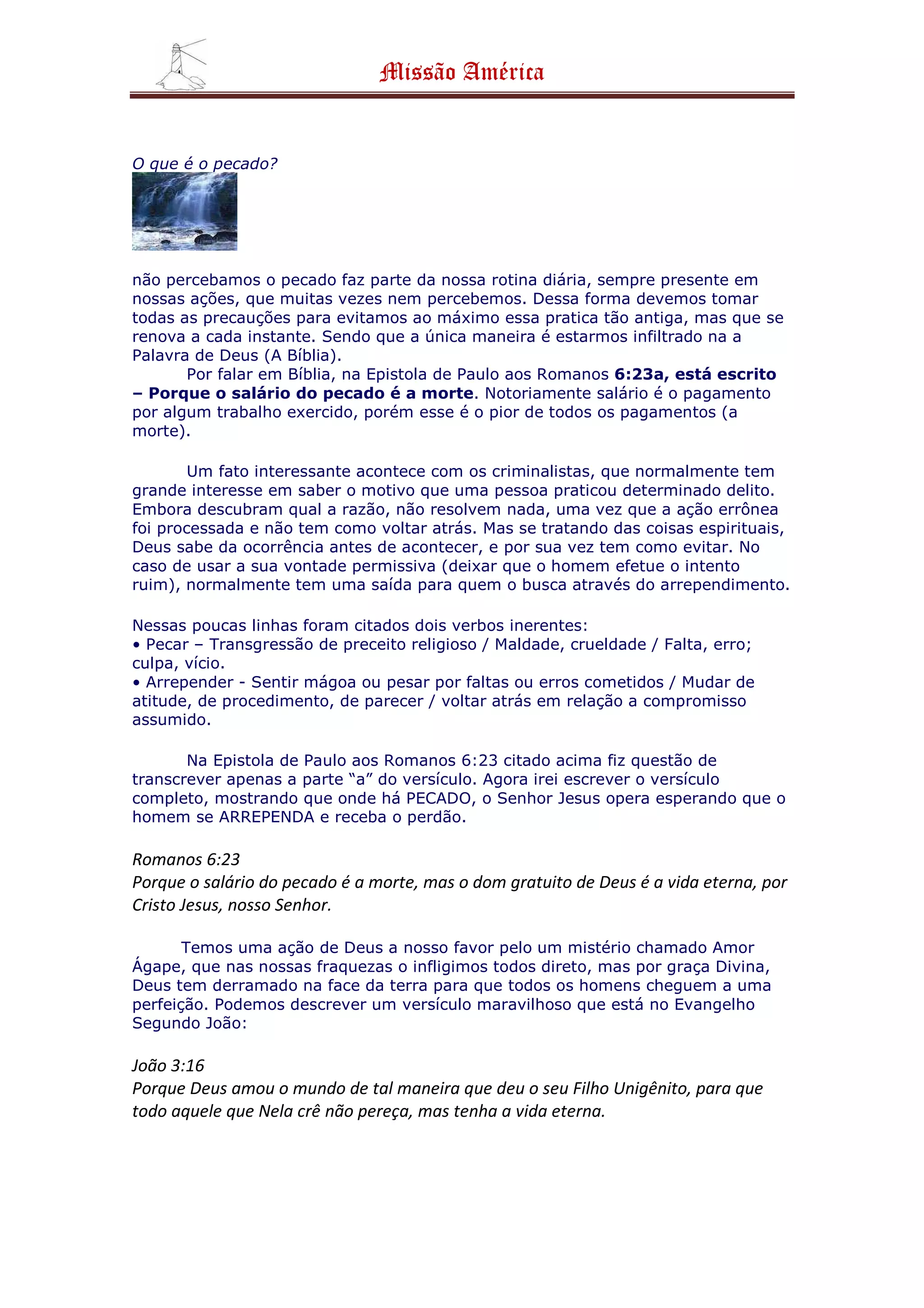 O documento discute o pecado e como Deus oferece perdão através de Jesus Cristo. Ele define pecado como uma transgressão religiosa e cita Romanos 6:23 que diz que o salário do pecado é a morte. No entanto, Deus oferece a vida eterna através de Cristo para aqueles que se arrependem. O documento também cita versículos de João 3:16 e Apocalipse 3:20 para mostrar o amor de Deus e como Jesus está sempre pronto para perdoar aqueles que se arrependem e abrem a port