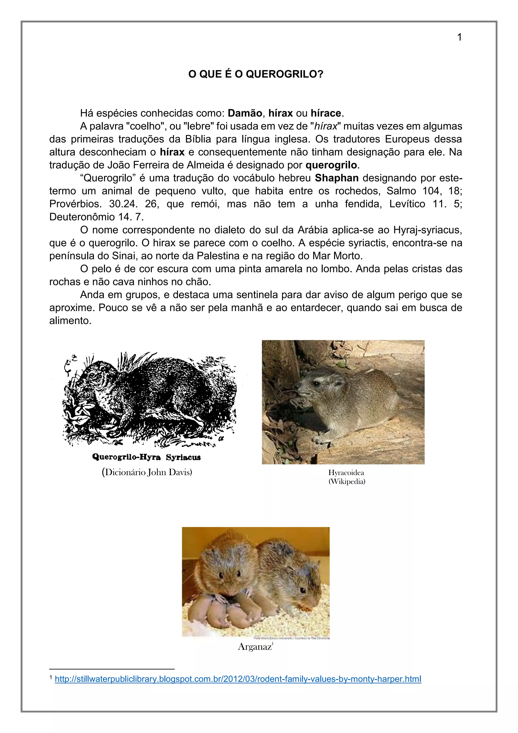 O documento explica o que é um querogrilo, que na Bíblia se refere a um animal pequeno que vive entre as rochas como o hírax. O querogrilo anda em grupos, tem pelo escuro com mancha amarela e não cava tocas no chão, vivendo nas cristas das rochas. É também chamado de arganaz ou coelho e rumina mas não tem unhas fendidas.