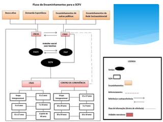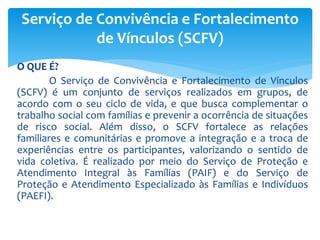 O documento descreve o Serviço de Convivência e Fortalecimento de Vínculos (SCFV), que oferece atividades socioeducativas para diferentes faixas etárias com o objetivo de promover a convivência social e familiar, prevenir situações de risco e fortalecer vínculos comunitários. O SCFV é ofertado por Centros de Referência de Assistência Social e Centros de Convivência para crianças, adolescentes, adultos, idosos e pessoas com deficiência em situação de vulnerabilidade.