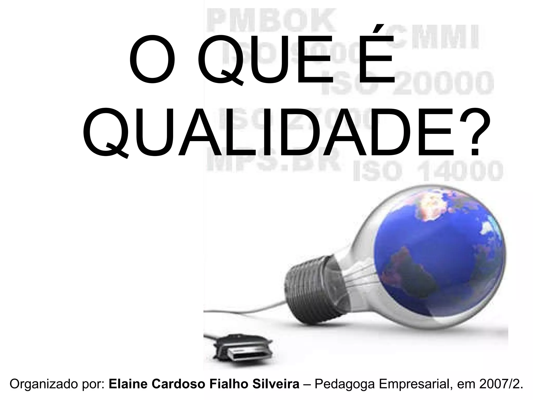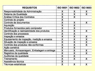 O documento discute o conceito de qualidade ao longo da história e como evoluiu para um enfoque no cliente. Também explica o que é o sistema de gestão da qualidade ISO 9000, que fornece diretrizes para garantir que os requisitos do cliente sejam atendidos de forma consistente. A certificação ISO 9000 traz benefícios como competitividade e relacionamentos comerciais, apesar de exigir investimentos para adequar os processos e a cultura organizacional.