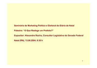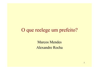 O documento descreve uma palestra sobre os fatores que influenciam a reeleição de prefeitos no Brasil. O palestrante discute estudos teóricos e empíricos sobre o assunto e apresenta os resultados de uma análise estatística dos determinantes da candidatura e reeleição de prefeitos brasileiros entre 1996-2000. De acordo com a análise, fatores como desempenho, condições políticas e características locais influenciam as chances de um prefeito ser reeleito.