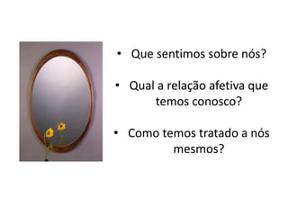 O documento discute como desenvolver o auto-amor através de três passos: 1) diluir a ilusão da inferioridade, 2) saber lidar com julgamentos alheios, e 3) cultivar a autonomia para não se acomodar a expectativas externas. Também enfatiza a importância de escutar os sentimentos internos, respeitá-los e amar a si mesmo.