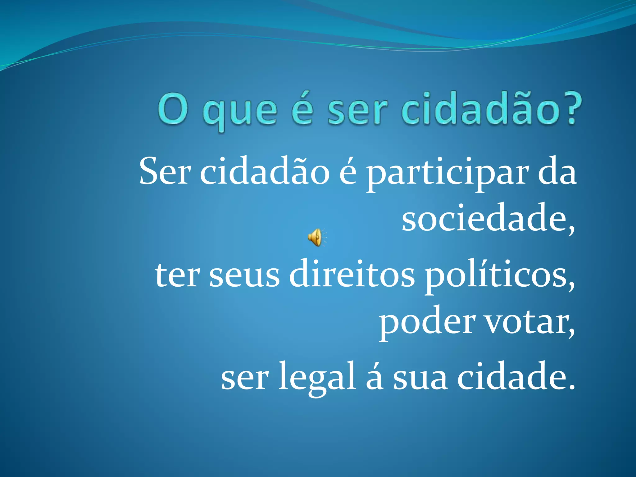 O documento lista os direitos e deveres de um cidadão, incluindo o direito à saúde, lazer e uma cidade limpa, bem como os deveres de respeitar as diferenças, manter a cidade limpa e respeitar as regras da comunidade. O documento foi criado por Evelin Oliveira, de 13 anos, para um projeto escolar.