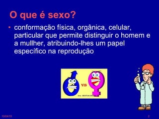 O documento discute os conceitos de sexo e gênero de uma perspectiva sociológica. Apresenta definições de intersexualidade e discute a rejeição da visão patológica do sexo por ativistas intersexuais. Também aborda a construção social do sexo anatômico e a distinção entre dimensão biológica e dimensão social no que se refere ao gênero. Por fim, fornece um glossário com definições-chave como gênero, identidade de gênero e movimento feminista.