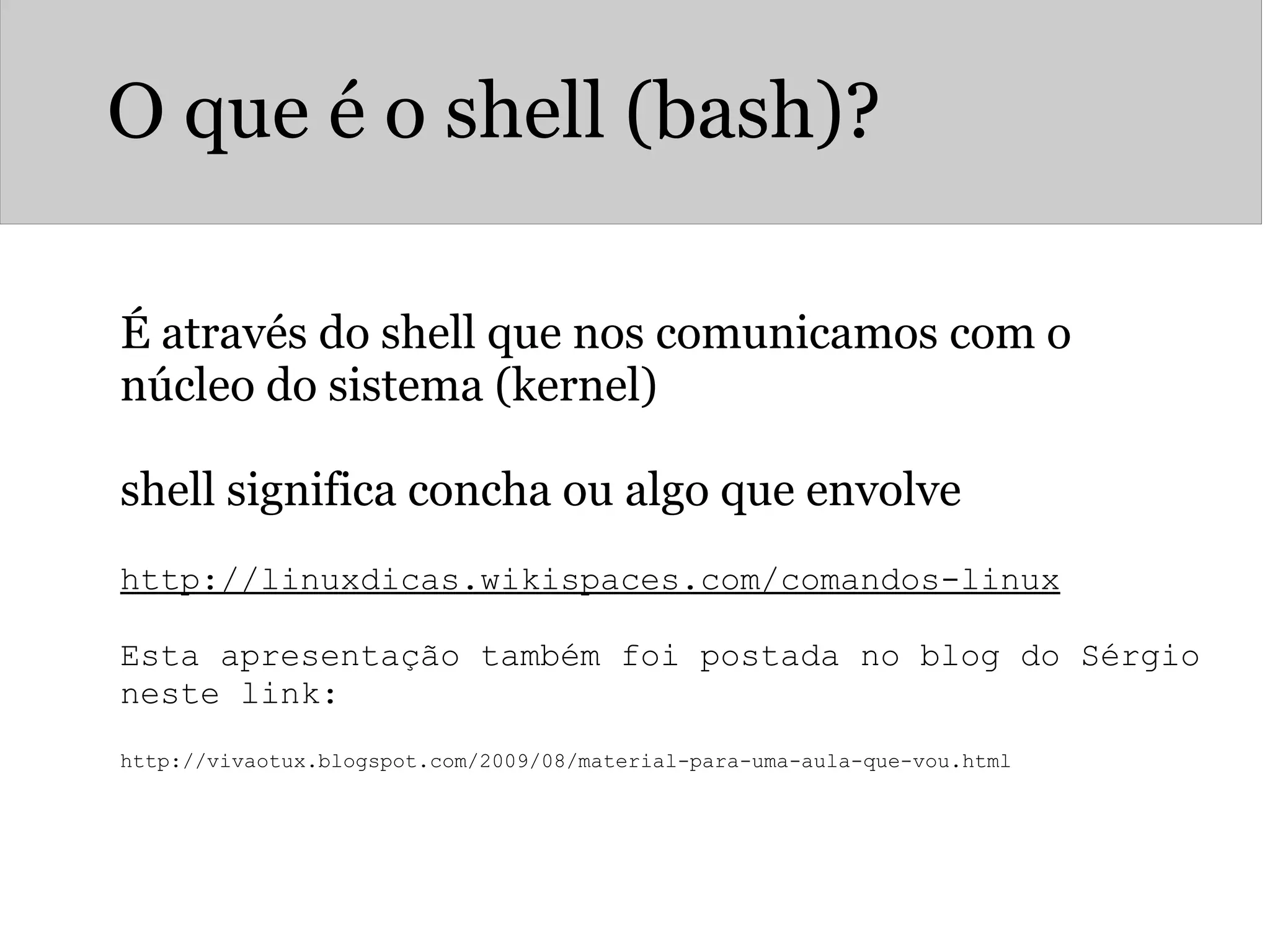 2) É apresentado vários comandos do shell como cd, ls, mkdir entre outros.