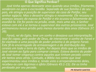 O documento discute o conceito de perdão através da história de José, que perdoou seus irmãos que o venderam como escravo, enfatizando que perdoar significa cancelar a culpa e que é uma força essencial na relação com Deus e os outros. O perdão, de acordo com a bíblia, é condicional, requerendo arrependimento, e não deve ser confundido com tolerância ao pecado ou a ausência de consequências. Para perdoar, é fundamental reconhecer nossa própria necessidade de perdão divino e lembrar que as ofensas contra nós são insignificantes em comparação com as que cometemos contra Deus.
