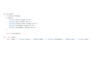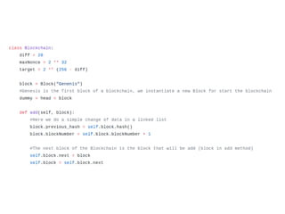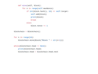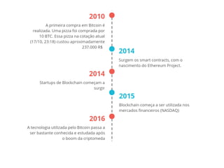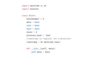 O documento discute o que são blockchains, como elas funcionam e como construir uma blockchain simples com Python. Ele explica que blockchains são registros públicos e descentralizados que usam consenso para validar transações sem intermediários. Também descreve como blockchains consomem poder computacional através da mineração e listam algumas utilidades além de criptomoedas, como saúde e registro de propriedades.