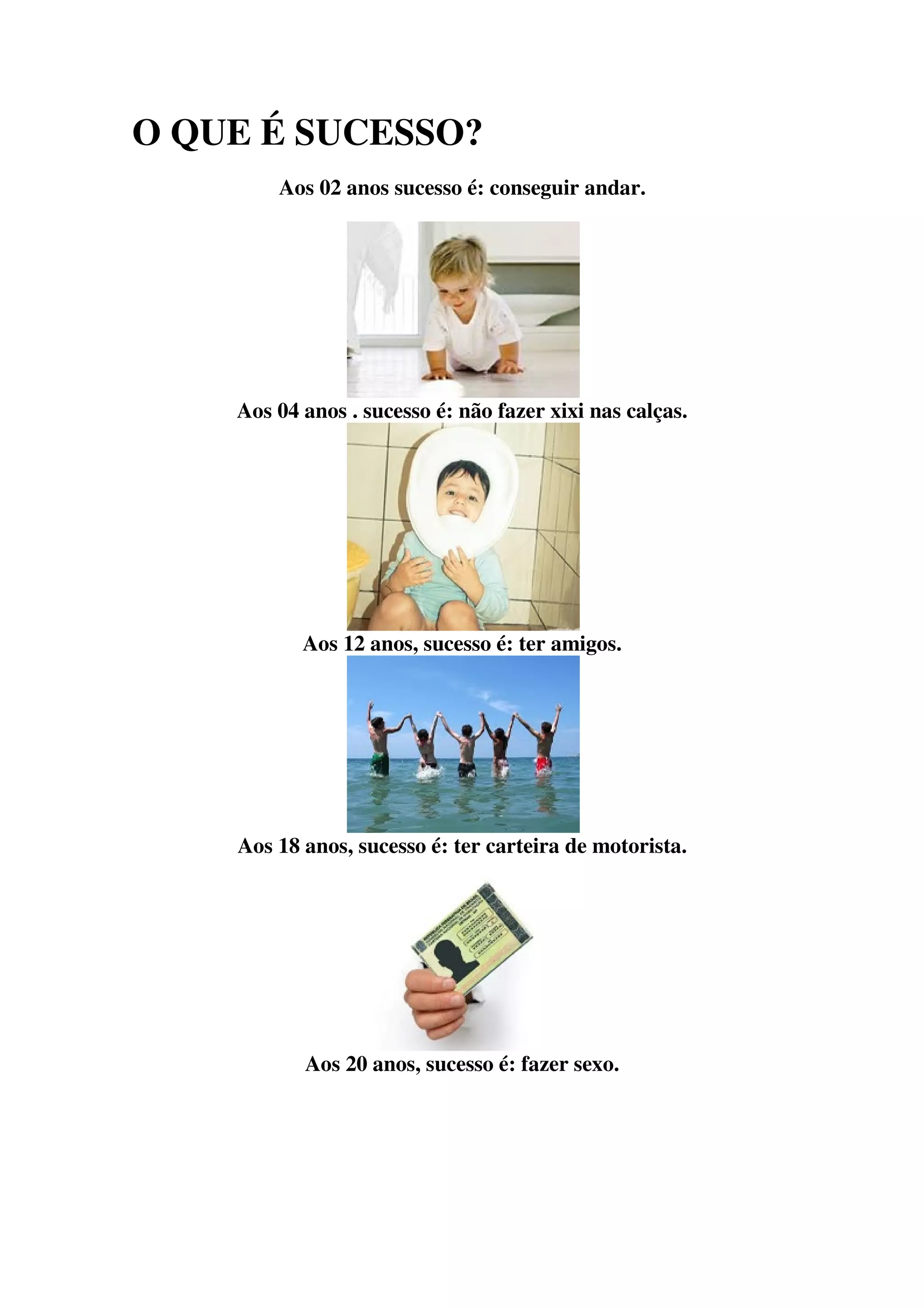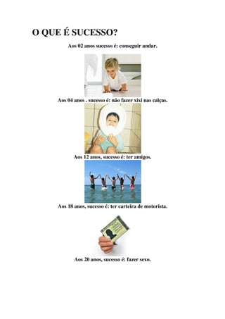O documento descreve como a definição de sucesso muda ao longo das diferentes fases da vida, desde conquistas básicas da infância como andar e não fazer xixi nas calças, passando por objetivos de socialização e independência na adolescência e vida adulta, até chegar a realizações mais simples na velhice, mostrando como o ciclo se repete. No final, ressalta a importância de aproveitar a vida com amor, brincadeiras e perdão.
