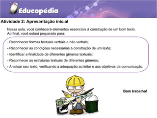 O documento apresenta uma série de atividades sobre a construção de textos. Aborda o que é um texto, suas características e elementos necessários, como contexto, intencionalidade e coerência. Também discute os diferentes gêneros textuais e suas estruturas e funções específicas. Por fim, guia atividades de produção e revisão de textos.