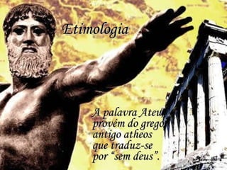 O documento discute o significado e a história do ateísmo. Define ateu como alguém que nega a existência de deuses. Explica que na antiguidade e idade média, ateus eram perseguidos. Também classifica ateus em duas categorias - passivos, que são céticos sobre provar a existência de deuses, e ativos, que negam simplesmente a existência de deuses.