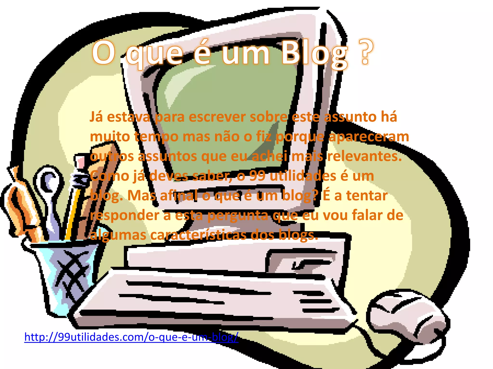 O documento explica o que é um blog, descrevendo suas características principais: (1) blogs surgiram em 1997 com o nome "weblog" e agora são atualizados frequentemente com "posts"; (2) blogs costumam ser mais interativos do que sites, permitindo comentários e troca de mensagens; (3) diferentes tipos de conteúdo podem ser postados, mas posts regulares são essenciais para manter um blog ativo.