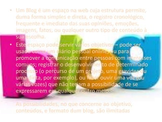 O documento explica o que é um blog, comparando-o com sites tradicionais. Um blog permite registrar conteúdo de forma cronológica e frequente, diferentemente de sites que demandam mais trabalho para atualização. Blogs tornaram-se populares por serem fáceis de criar e manter, permitindo interação por meio de comentários.