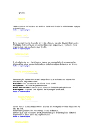 Um relatório científico comunica os resultados de um trabalho de pesquisa ou laboratorial. Deve ser objetivo e claro. Contém seções como capa, índice, objetivo, introdução, parte experimental, resultados, conclusões e bibliografia. A capa inclui título, local, data e autores. A introdução resume a pesquisa bibliográfica. A parte experimental descreve o protocolo e montagem. Os resultados são apresentados em tabelas com cálculos quando necessário. As conclusões analisam os resultados principalmente comparando-os com a literatura.