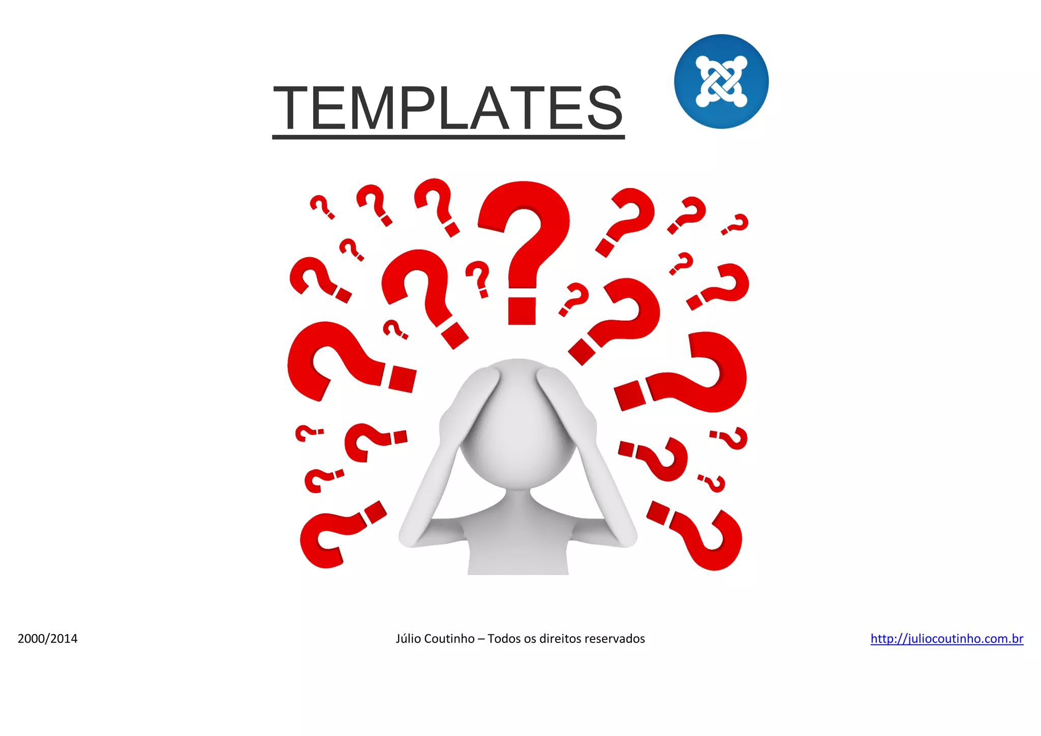 O documento apresenta uma explicação detalhada sobre templating no Joomla, incluindo a estrutura e os diretórios necessários para templates de front-end e back-end. Ele também descreve a importância do arquivo index.php e as boas práticas na programação orientada a objetos para separar lógica e apresentação. Além disso, menciona arquivos importantes como component.php, error.php e templatedetails.xml, que ajudam na funcionalidade e apresentação do template.