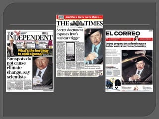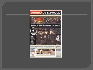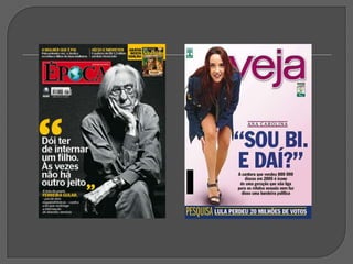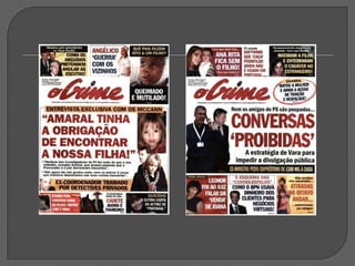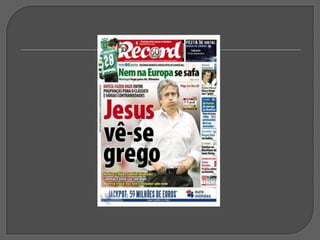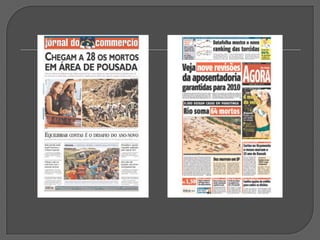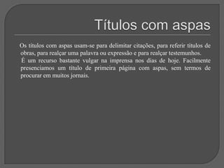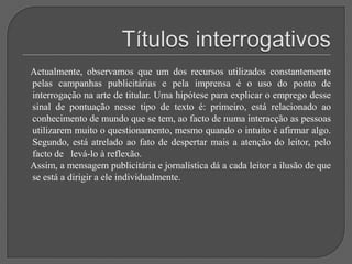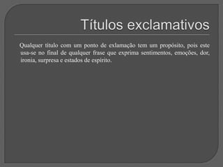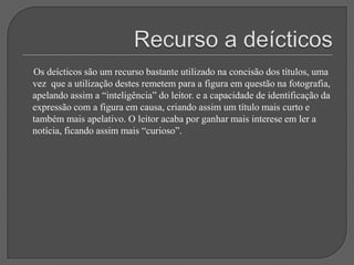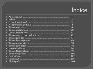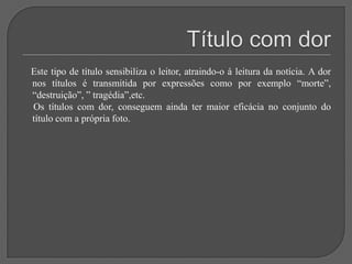 Este documento discute vários tipos e técnicas de titulação, incluindo: a importância do título; títulos sem verbos; títulos metafóricos; uso da mesma foto em diferentes jornais; títulos com deícticos; títulos que evocam dor; títulos interrogativos; títulos exclamativos; títulos com aspas; intertitularidade; títulos nacionalistas; erros ortográficos; e a conclusão de que um bom título combinado com uma