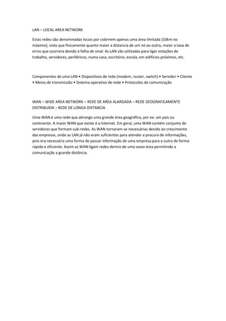 O documento descreve o que é uma rede informática, suas vantagens e tipos de redes. Uma rede informática permite compartilhar recursos como dados e impressoras entre computadores. Redes podem economizar recursos, identificar usuários e reduzir custos de manutenção. Há redes locais (LAN) para áreas limitadas e redes de longa distância (WAN) para áreas geográficas amplas. O documento também explica três topologias de rede: barramento, estrela e anel.