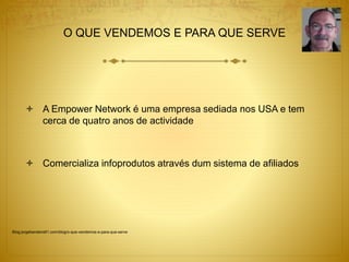 A Empower Network é uma empresa americana que oferece infoprodutos, incluindo cursos de marketing digital, através de um sistema de afiliados. Os produtos ensinam a desenvolver negócios online e incluem uma plataforma de blog viral e orientações sobre geração de tráfego e vendas. Embora não garantam rendimentos, os cursos prometem potencial de lucro significativo, com comissões de até 100% sobre as vendas.