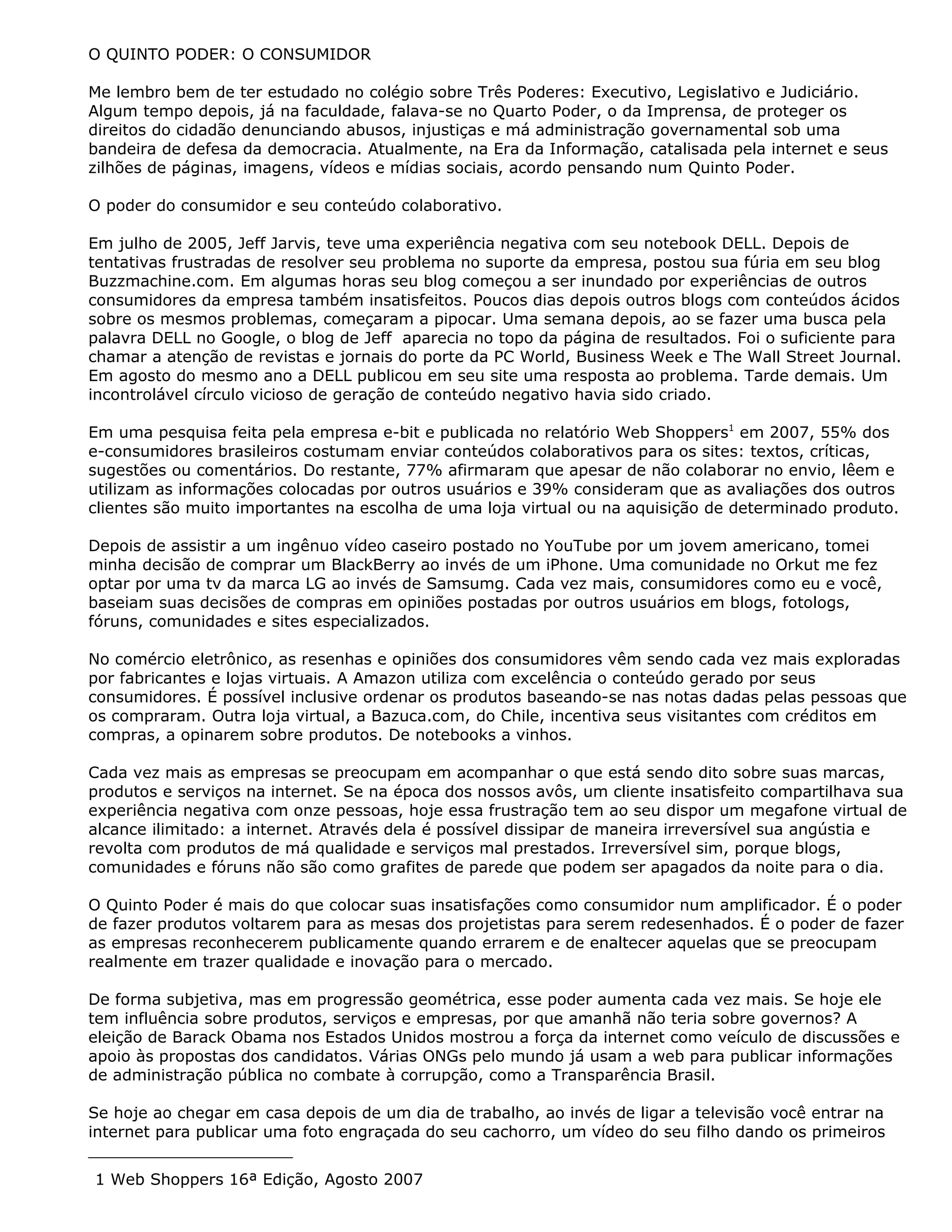 O documento discute o "Quinto Poder", o poder do consumidor e seu conteúdo colaborativo na era digital. Ele explica como os consumidores podem influenciar empresas através de avaliações e críticas online, e como as empresas precisam monitorar o que é dito sobre elas. Também sugere que o poder do consumidor pode eventualmente influenciar governos da mesma forma.