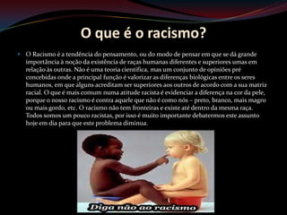 O documento discute o conceito de racismo, afirmando que é a ideia de que algumas raças humanas são superiores a outras. Apesar de não ter base científica, o racismo persiste no mundo através de atos discriminatórios. O documento também aborda a questão da igualdade entre todos os seres humanos e a importância de denunciar atos racistas.