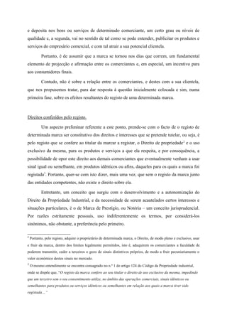 [1] O documento discute as marcas de prestígio e notoriedade e se estas podem servir como fundamento para não apresentar a Declaração de Intenção de Uso durante o registro de uma marca. [2] Explica que as marcas são parte integrante dos direitos de propriedade industrial e distinguem produtos e serviços de diferentes comerciantes. [3] Argumenta que as marcas de prestígio merecem proteção especial contra uso indevido por terceiros devido à sua notoriedade entre consumidores.