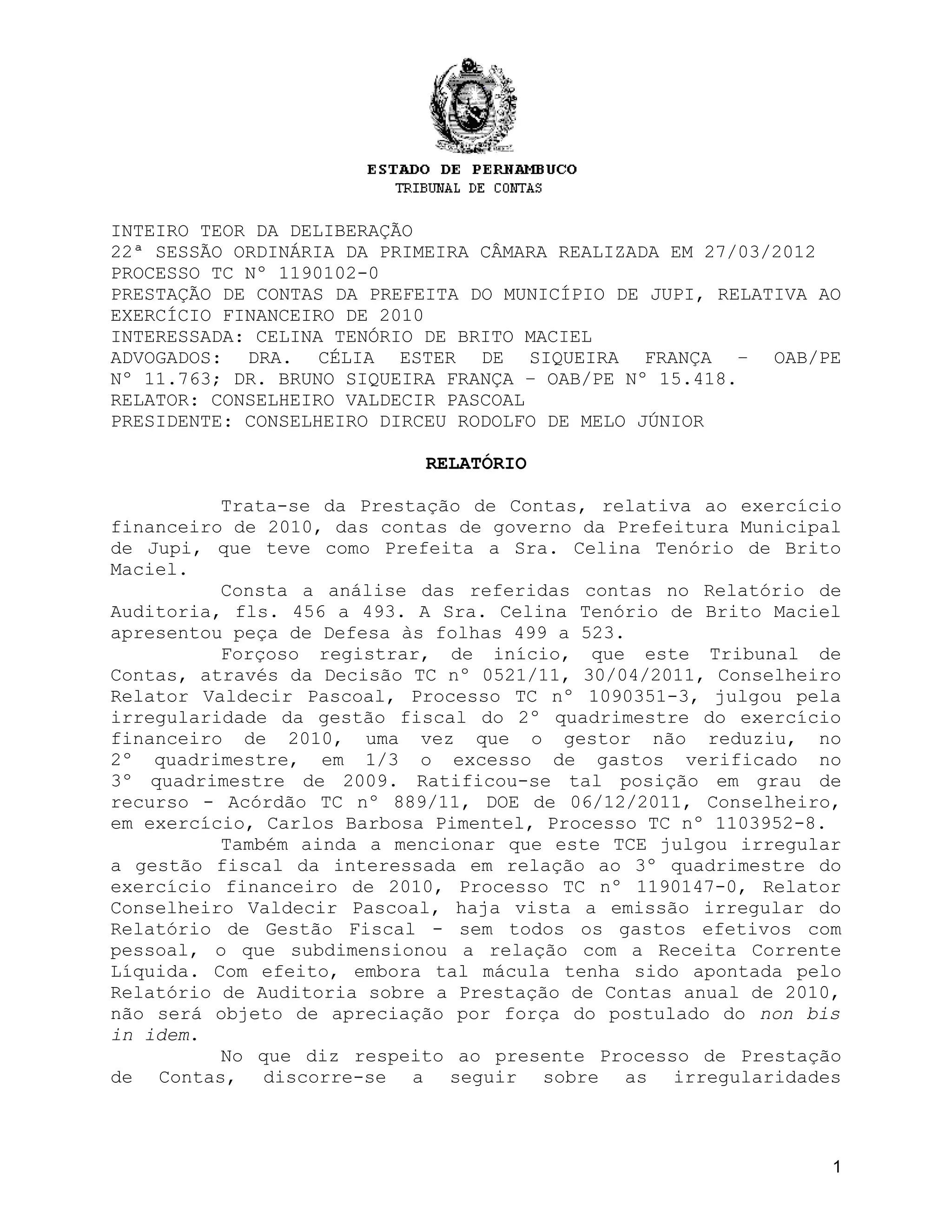 O documento resume a 22a Sessão Ordinária da Primeira Câmara realizada em 27/03/2012 para julgar a prestação de contas da Prefeita do município de Jupi relativa ao exercício financeiro de 2010. O relator votou pela rejeição das contas devido à falta de recolhimento de contribuições previdenciárias ao RPPS e RGPS, contrariando princípios constitucionais e leis. Os demais conselheiros acompanharam o voto do relator.