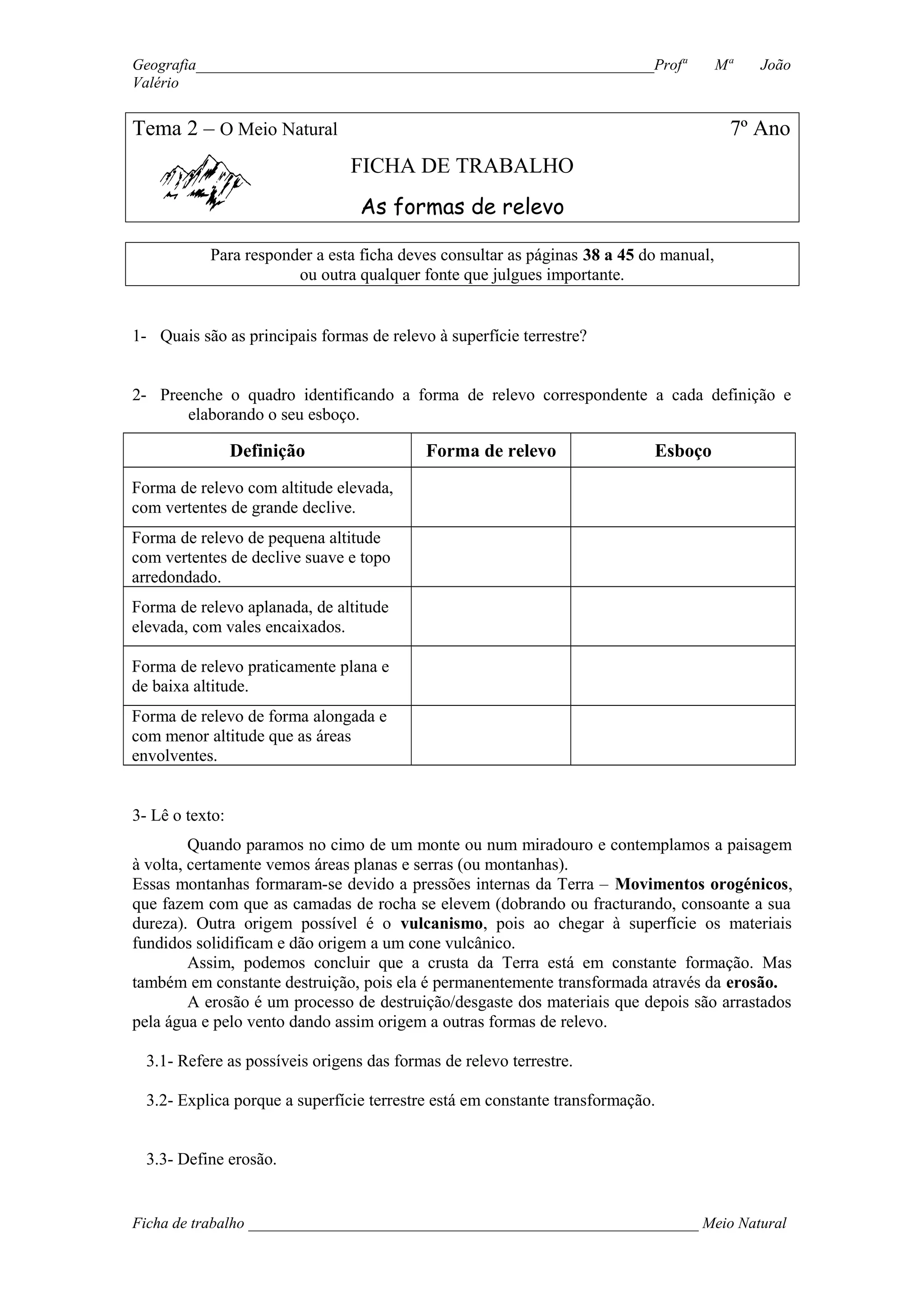 Este documento é uma ficha de trabalho sobre as formas de relevo terrestre para um aluno do 7o ano. A ficha pede ao aluno para identificar as principais formas de relevo, preencher um quadro com suas definições e esboços, e responder perguntas sobre a origem das formas de relevo e erosão. A ficha também pede ao aluno para preencher um quadro sobre as principais cadeias montanhosas dos continentes e de Portugal.