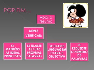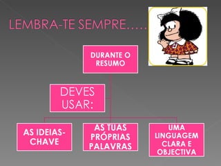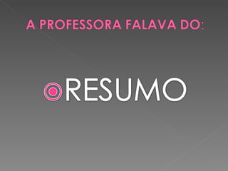 O texto descreve uma aula sobre como resumir textos. A professora explica as regras para fazer um resumo conciso, como mencionar apenas as ideias principais e seguir a ordem original do texto. Os alunos praticam resumindo notícias. Um aluno erra ao fornecer detalhes desnecessários. A professora o corrige mostrando como fazer um resumo em poucas palavras.